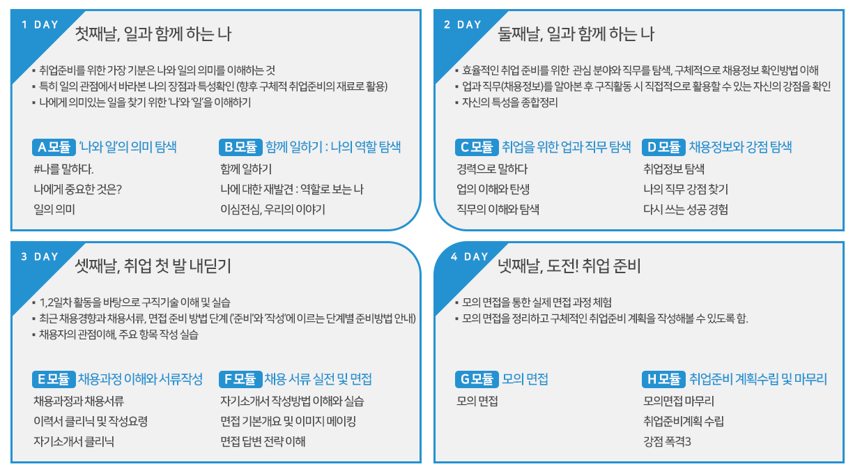 | 목적 | 자신에게 맞는 직업을 결정하고, 결정한 직업에 관한 구체적인 정보를 찾아보도록 함으로써 본 프로그램을 마친 후에도 구직의 노력을 지속하도록 돕는다. |